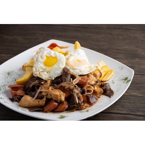 Papas fritas, carne, pollo, huevo, chorizos y un salteado de cebolla caramelizada.
