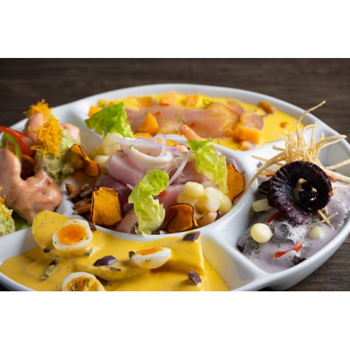 Tiradito criollo, coctel de camarones, cebiches mixto, pulpo al olivo y papa a la huancaina.
