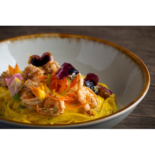 Fetuccine a la ajiamarillo y especias peruana servido con camarones al pil pil.