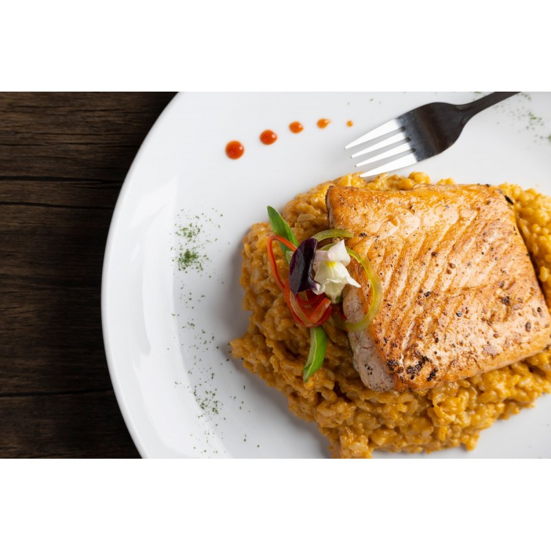 Salmon apanado con salsa anticuchera, acompañado de risotto al aji amarillo y pimentón asados.